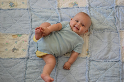 This boy keeps me busy. He started rolling over a couple weeks ago and now likes to roll back and forth. He rolled across an entire room yesterday. And he's found his feet. What fun!